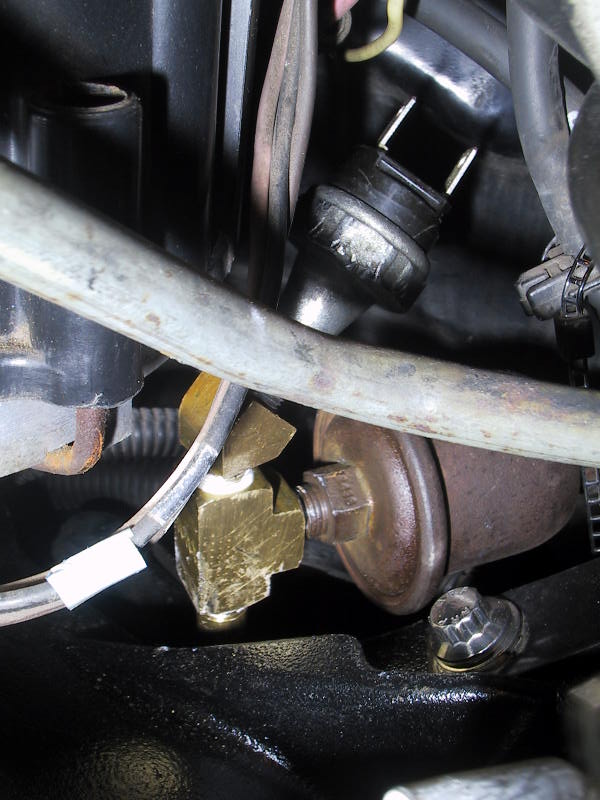 Another alternative is to connect a length of braided hose to the tap in the front of the block behind the water pump. Install the analog sender onto the other end of the braided hose. Route the hose toward the back of the engine and connect the sender to the stock wring harness.